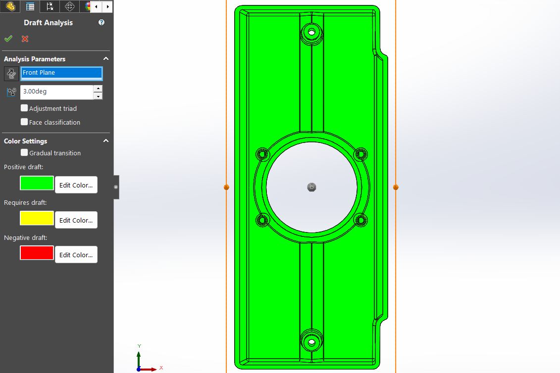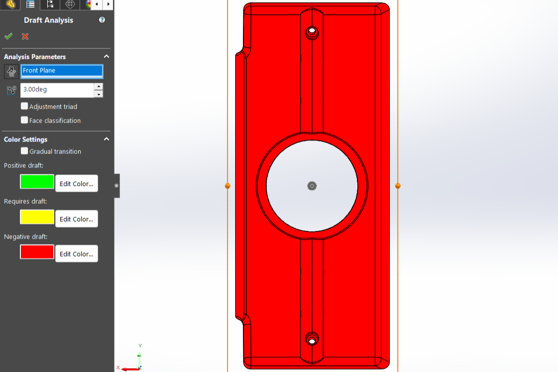 SOLIDWORKS draft analysis was used to evaluate and refine the bezel geometry for molding. The design prioritized uniform wall thickness, adequate draft angles, and properly radiused fillets to reduce tooling complexity, improve part release, and minimize the risk of defects such as sink, warpage, and incomplete fill.